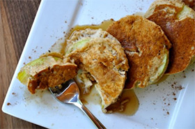 - Dip each sliced apple ring into the batter, and rub to fully cover it. Transfer to the preheated griddle and cook as you would a regular pancake. Repeat with all of the apple slices. Serve with a little sprinkle of cinnamon. Enjoy!